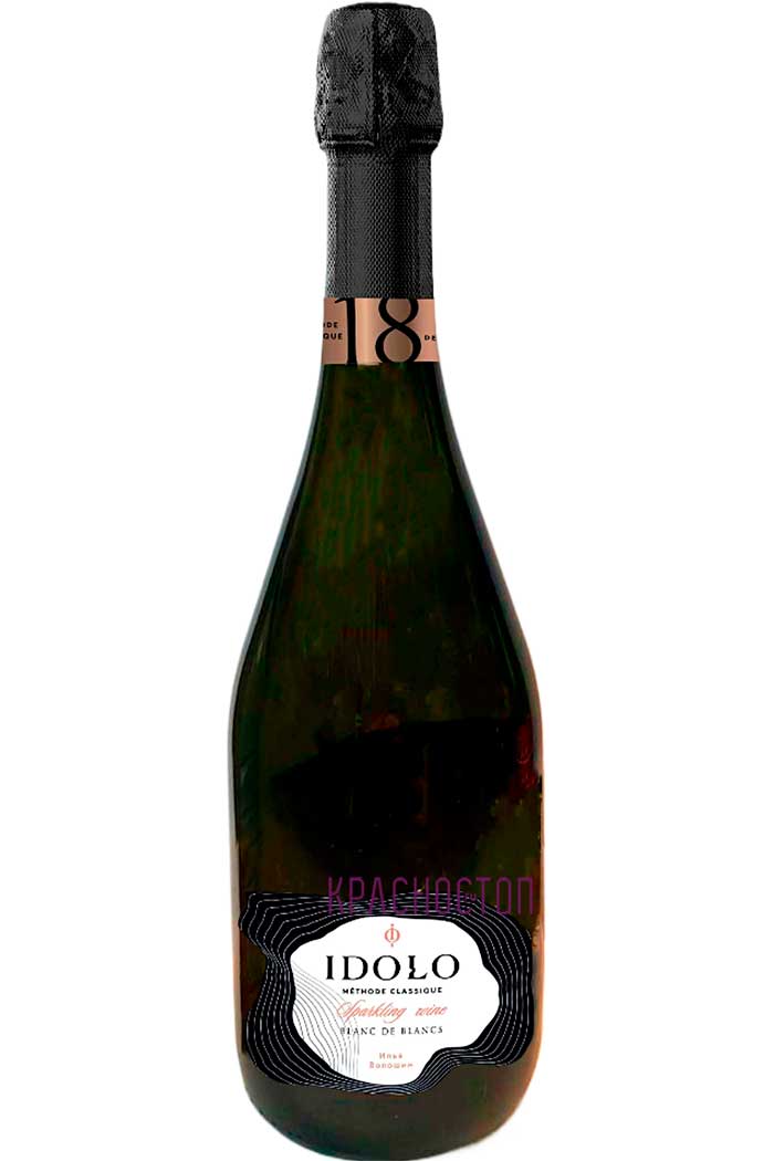 Игристое вино Idolo Blanc de Blancs первый релиз игристого, изготовленного классическим методом из винограда сорта шардоне крымским шампанистом Ильей Волошиным на заводе "Олимп". Выдержка на дрожжевом осадке 18 месяцев.