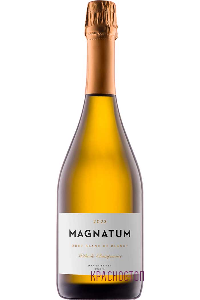 Белое игристое вино Магнатум Блан Де Блан Брют создано из винограда сорта шардоне, выращенного в уникальном терруаре Долины Лефкадия (Крымский район Краснодарского края). Почвы мергеля привносят в вино характерную минеральность и элегантность, вино произведено по классической шампанской технологии на винодельческом предприятии "Олимп", первичная ферментация проходила в стали для сохранения свежести, после чего вино выдерживалось на полном дрожжевом осадке в течение 6 месяцев, формируя округлую текстуру, вторичное брожение и длительная выдержка в бутылке на протяжении 12 месяцев.