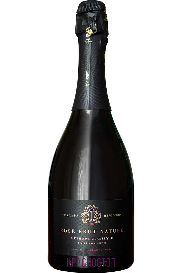 Розовое игристое вино Усадьба Перовских Розе Брют Натюр производится методом бутылочной шампанизации из винограда сорта пино нуар, выращенного в долине реки Бельбек, первичное брожение в ёмкостях из нержавеющей стали при низких температурах, выдержка на дрожжевом осадке 24 месяца.