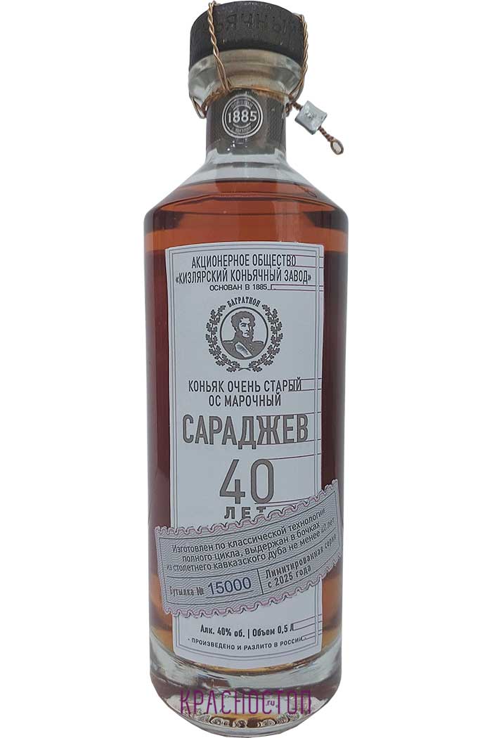 Кизлярский коньяк Сараджев выдержанный 40 лет ОС (очень старый), исключительно сложный и многогранный бренди с нотами старого дуба, шоколада, ванили, сухофруктов и восточных пряностей. Вкус отличается мягкостью, маслянистостью и долгим, теплым послевкусием.
