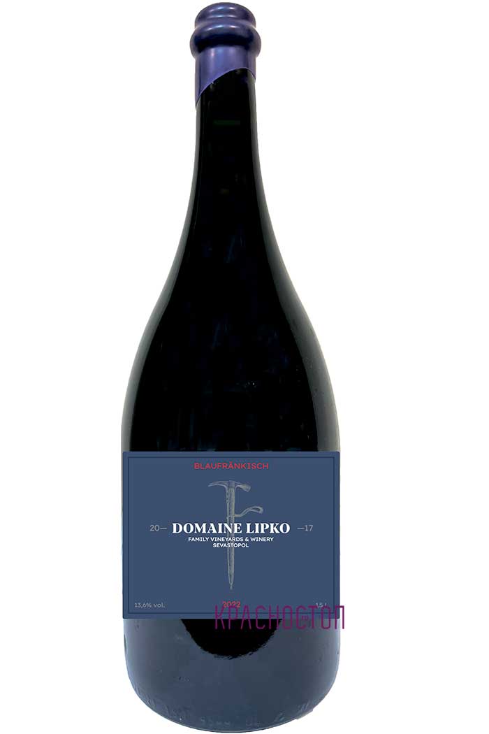 Красное сухое вино Домен Липко Блауфранкиш магнум производится из одноименного сорта винограда блауфранкиш/франковка, выращенного на собственных виноградниках в Севастопольской винодельческой зоне. Ручной сбор винограда, брожение при контроле температуры в нержавеющей стали, выдержка в 500-литровых новых французских дубовых бочках Sylvain 18 месяцев, бутылочная выдержка не менее 6 месяцев. Тираж 150 бутылок.
