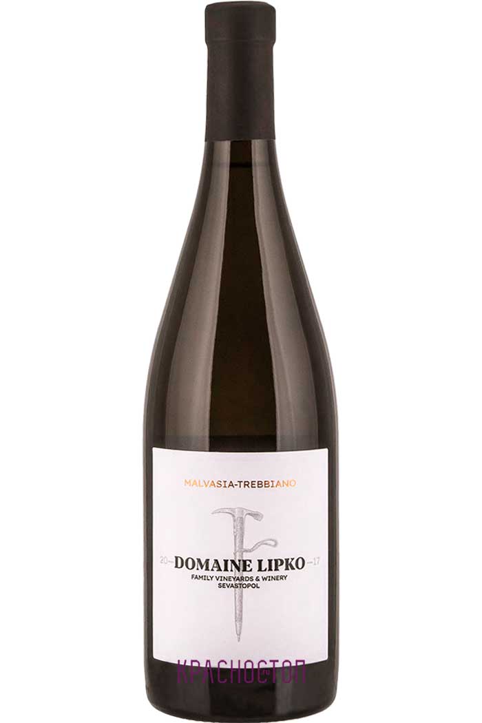 Белое сухое вино Домен Липко Мальвазия Треббьяно производится из бленда одноименных сортов винограда, выращенного в Севастопольской винодельческой зоне. Ручной сбор винограда, коферментация, выдержка 8 месяцев на тонком дрожжевом осадке, 6 месяцев выдержка в 500 литровых бочках Cadus легко обжига, дополнительный отдых в бутылках не менее двух месяцев. Тираж 1900 бутылок.