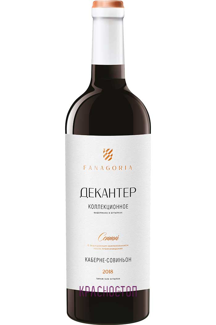 Красное сухое коллекционное вино категории ЗНМП "Сенной" Фанагория Декантер Каберне Совиньон урожая 2018 года производится из одноименного европейского сорта винограда. Ферментация в пижажных винификаторах, ямб на мезге, выдержка в бочках из французского дуба 24 месяца и 36 месяцев в бутылка при контроле температуры и влажности. Тираж 2160 бутылок.
