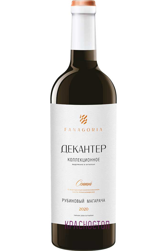 Красное сухое коллекционное вино категории ЗНМП "Сенной" Фанагория Декантер Рубиновый Маграча урожая 2020 года производится из одноименного винограда советской селекции. Виноград собирается в оптимальной технологической зрелости. После дробления проводится ферментация при контролируемой температуре с мацерацией около 14-18 дней для экстракции цвета, танинов. Вино выдерживается 12 месяцев в бочках из французского и американского дуба и 36 месяцев в бутылках в помещении с контролем температуры и влажности. Тираж 2300 бутылок.