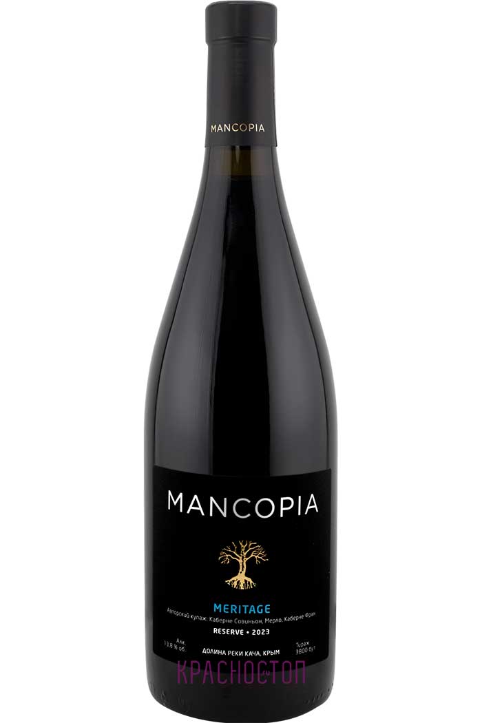 Красное сухое вино Манкопия Меритаж Резерв производится из бленда сортов винограда каберне совиньон ( 50 % ), мерло ( 40 %), каберне фран ( 10 %), выращенного в Севастопольской винодельческой зоне, который служит основой бордоского бленда. Терруар характеризуется щелочными суглинками с включениями гравия и известняка. Сухой климат, обилие солнечных дней и постоянный морской бриз обеспечивают идеальные условия для медленного и полного созревания ягоды, снижая риск заболеваний. Это придаёт винам чёткую кислотность, минеральный оттенок и собранную структуру. После ферментации вино проходит 12-месячную выдержку в бочках из французского и венгерского дуба, что добавляет сложности, не перекрывая фруктовую чистоту. Стилистика вина — мощное, структурированное, с потенциалом к выдержке, но уже готовое к употреблению.