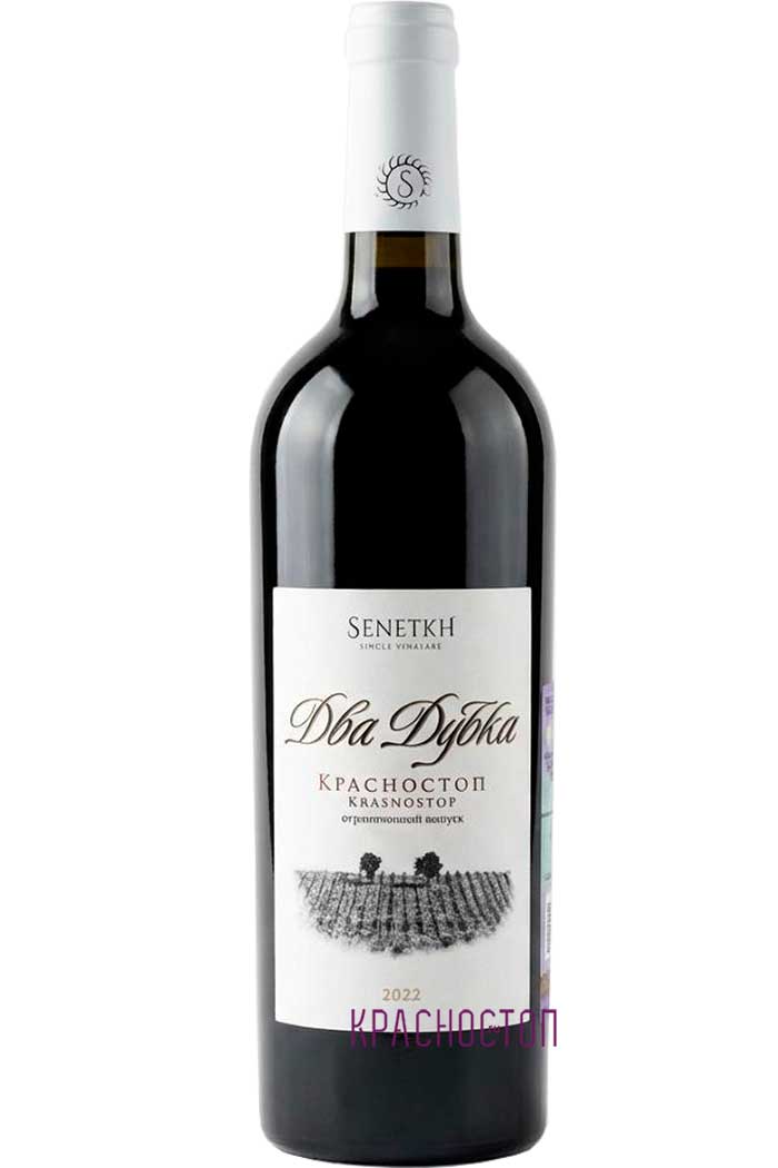 Красное сухое моносортовое вино Сенетх Два Дубка Красностоп 2022 производится из донского сорта винограда красностоп золотовский, выращенного на отдельном винограднике «Сенетх» в государственном заказнике «Красная горка» на уникальных дерново-карбонатных почвах с материнской породой из мергеля и третичных известняков. Виноград собран вручную с тщательной сортировкой прямо на винограднике, после дробления длительная холодная мацерация при температуре 3–5°C в течение 22 суток, ферментация проходила при контролируемой температуре 14 дней с применением ремонтажа, общая мацерация на мезге составила 50 дней, включая 14 дней яблочно-молочного брожения, выдержка 12 месяцев в 500-литровых бочках из французского дуба первого пассажа и еще 12 месяцев бутылочной выдержки. Задачей было, создать вино для длительной выдержки, исходя из того, что 2022 год был благоприятным, отличался отсутствием экстремальных погодных условий длительных засух и продолжительных обильных осадков. Лимитированный тираж.