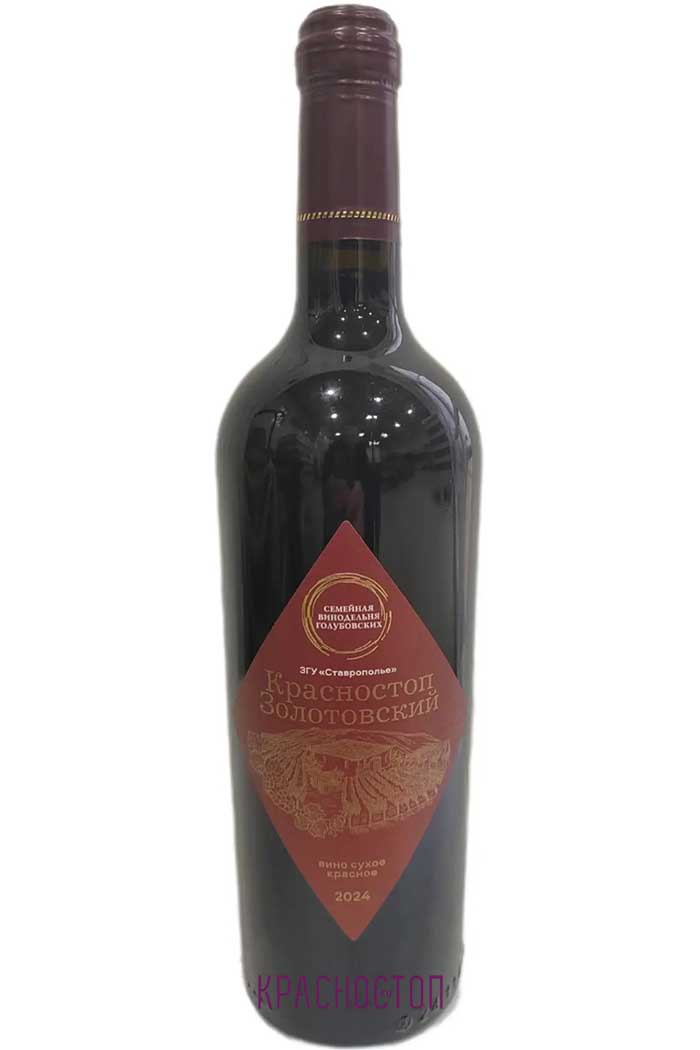 Красное сухое вино категории ЗГУ Ставрополье Семейная Винодельня Голубовских Красностоп Золотовский производится из одноименного донского сорта, выращенного на собственных виноградниках хозяйства рядом с селом Левокумское Ставропольского края. Вино выдерживается в бочках из кавказского дуба 12 месяцев.