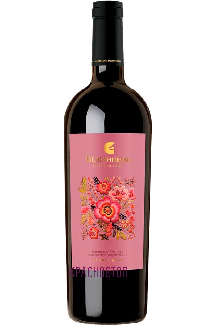 Розовое сухое вино категории ЗГУ Долина Дона Ведерниковъ Розовое производится из бленда сортов винограда красностоп золотовский и цимлянский черный, выращенного на Правом Берегу дона близ хутора Ведерниковъ